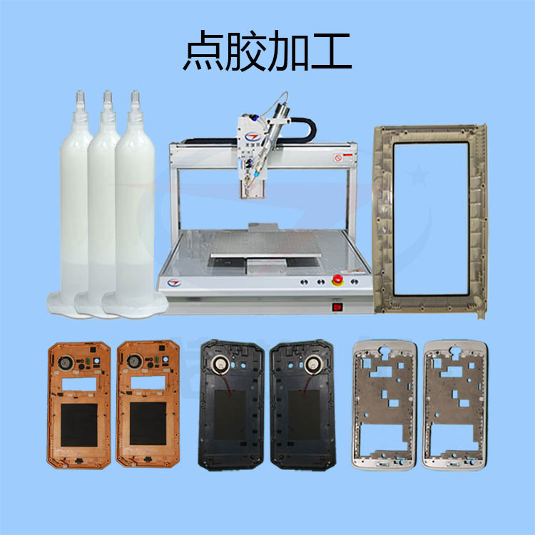 熱壓結(jié)構(gòu)膠點(diǎn)膠加工是依序?qū)ぜM(jìn)行點(diǎn)膠、熱壓合,然后靜置工件,待使用于壓合的膠體冷卻凝固。熱壓結(jié)構(gòu)膠點(diǎn)膠加工所采用的熱壓結(jié)構(gòu)膠是一種固化或干燥后具有一定性能的一種膠黏劑,它通常以基體樹脂和其他填料組成,通過(guò)基體樹脂的粘接作用把其他輔助填料結(jié)合在一起,形成性能優(yōu)良的膠體,實(shí)現(xiàn)被粘材料的良好的連接。